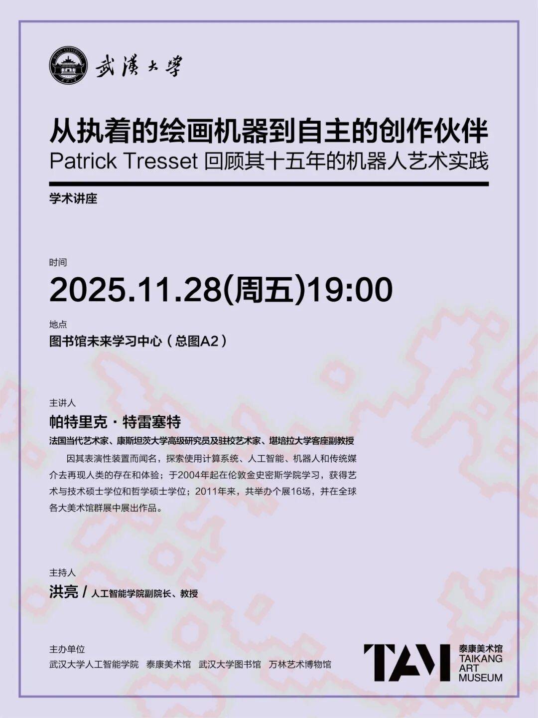从题:《从的绘画机械到自从的创做伙伴:Patrick Tresset 回首其十五年的机械人艺术实践》帕特里克·特雷塞特 法国现代艺术家、康斯坦茨大学高级研究员、大学客座副传授从办单元:武汉大学数学取统计学院、武汉大学藏书楼、万林艺术博物馆