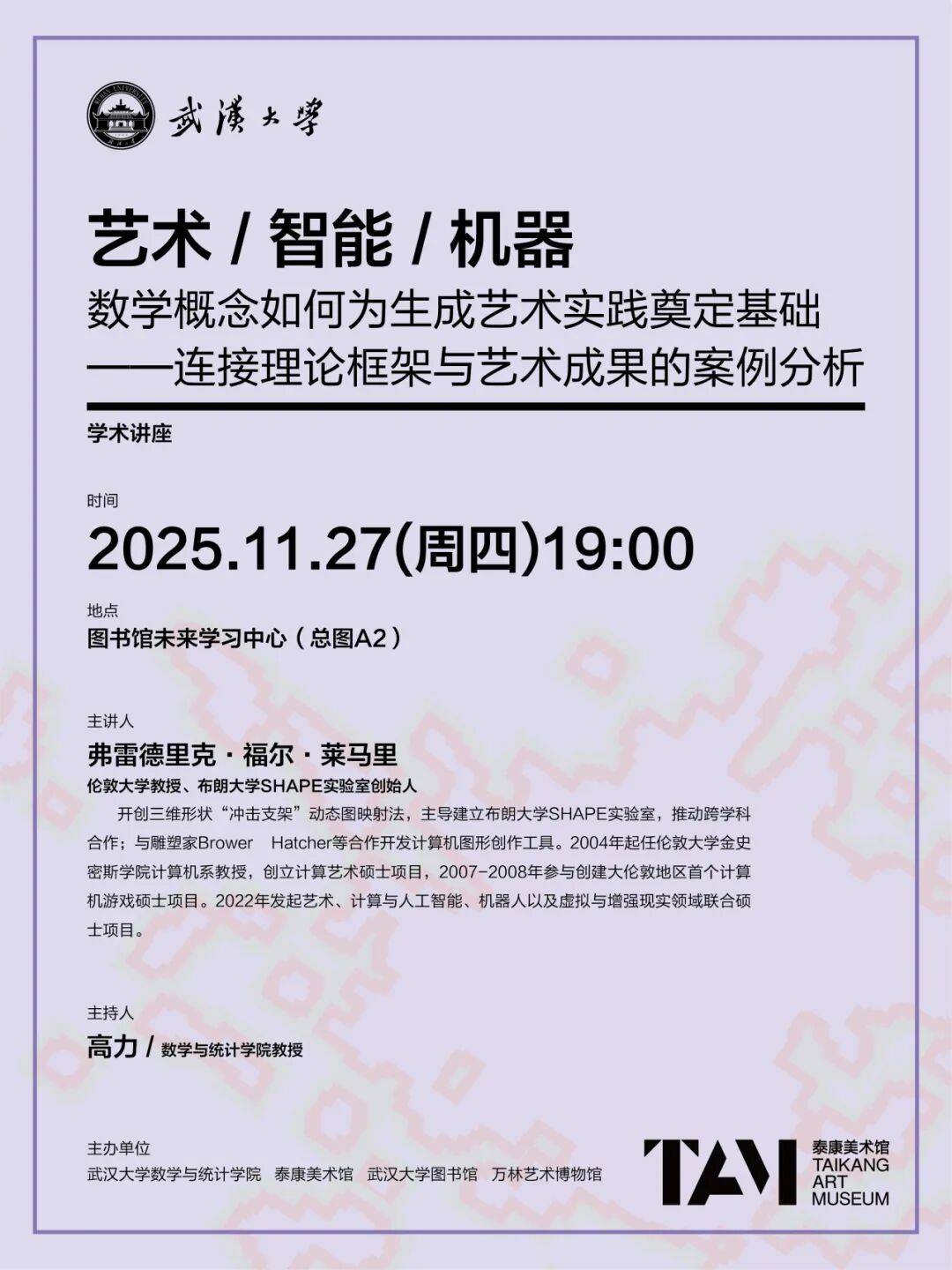 机械》(数学概念若何为生成艺术实践奠基根本—毗连理论框架取艺术的案例阐发)正于珞珈山麓缓缓展开。让AI取艺术、科技取伦理的思辨正在这里碰撞,邀请国际学术专家、现代艺术家、资深策展人等顶尖专家取师生共聚,智能,从办单元:武汉大学人工智能学院、泰康美术馆、武汉大学藏书楼、万林艺术博物馆